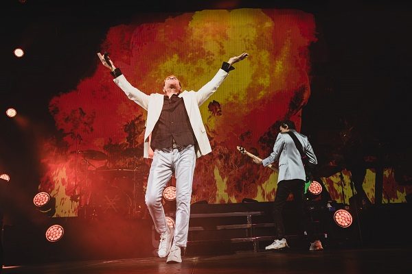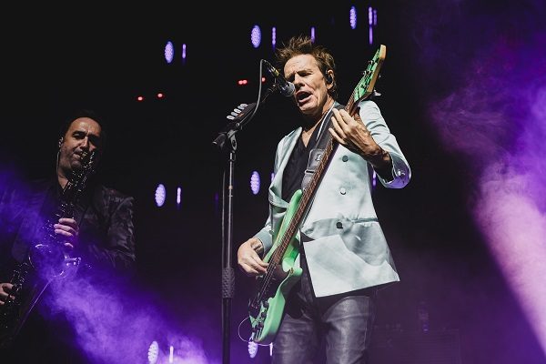 L’arrivée des membres de Duran Duran sur scène a un petit côté mégalo avec la diffusion d’un film quelque peu futuriste qui les voit dans des vaisseaux spatiaux se poser sur terre avec en fond sonore le récent « Velvet Newton » issu de « Future Past » (2021). Ils apparaissent dans une débauche de lumière et sont d’entrée acclamés par le public. Il y a bien sûr le quartet originel à savoir le célèbre Simon Le Bon au chant, le reconnaissable entre mille Nick Rhodes aux claviers, le toujours sémillant John Taylor à la basse et le plus discret Roger Taylor à la batterie.