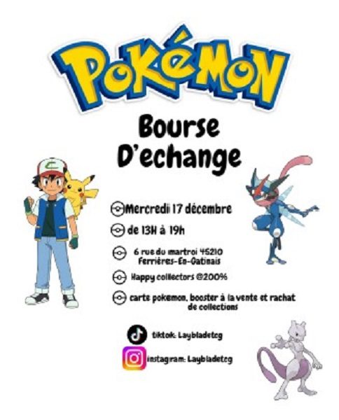 Bonjour, nous avons le plaisir de vous inviter à notre Bourse d’échange, un événement incontournable pour tous les passionnés de cartes Pokémon et collectionneurs !