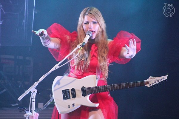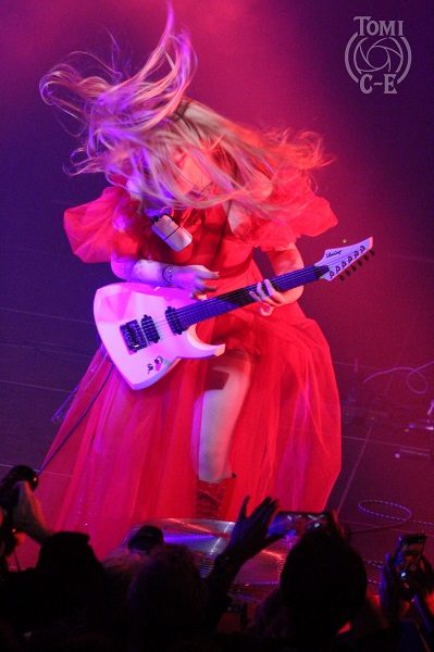Elle initiera un Wall Of Death dans la fosse de La Batterie et quelques intrépides se risqueront à des Slams au dessus du public, notamment un jeune garçon, pour le plus grand plaisir de notre chanteuse. Certains fans de la première heure brandiront des pancartes « Higher »/ »Fire » pour le morceau du même nom issu du EP « Brutal Pop » de 2019. Mais c’est surtout le tout dernier album « Krystal Metal », sorti l’année dernière, qui sera mis en avant avec des brûlots comme les syncopés « Come Clean » et « Painful Attraction », le bien Heavy « Free Your Soul » ou le très accrocheur « Sirius Love » qui m’a rappelé un peu Kim Wilde mais sous amphétamine. Dommage que la guitare « Hello Kitty » ait été oubliée pour le Show, je pense qu’un membre de l’équipe a dû se faire taper sur les doigts pour cette bévue…